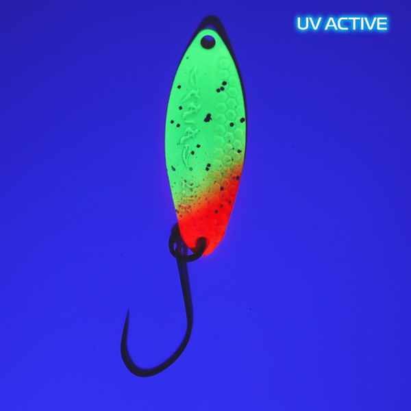 GAiA von GOD HANDS ist ein Spoon, der durch seine Form jeden begeistern kann. Lang gezogen und breitflächig zugleich, mit einem mittigen „Bruch“, der allmählich mit einer Y-förmigen Biegung endet. Die eine Hälfte des Spoons hat dabei mehrere sechseckige Schnitte, die bei der Führung für einen einmaligen flimmernden Effekt sorgen. In der Kombination mit seinem sehr frequenten Lauf lässt GAiA selbst die zickigsten Forellen nicht kalt