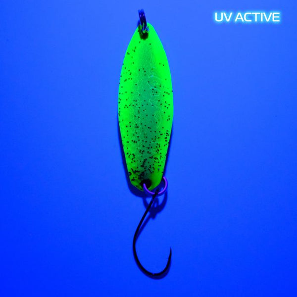 GAiA von GOD HANDS ist ein Spoon, der durch seine Form jeden begeistern kann. Lang gezogen und breitflächig zugleich, mit einem mittigen „Bruch“, der allmählich mit einer Y-förmigen Biegung endet. Die eine Hälfte des Spoons hat dabei mehrere sechseckige Schnitte, die bei der Führung für einen einmaligen flimmernden Effekt sorgen. In der Kombination mit seinem sehr frequenten Lauf lässt GAiA selbst die zickigsten Forellen nicht kalt