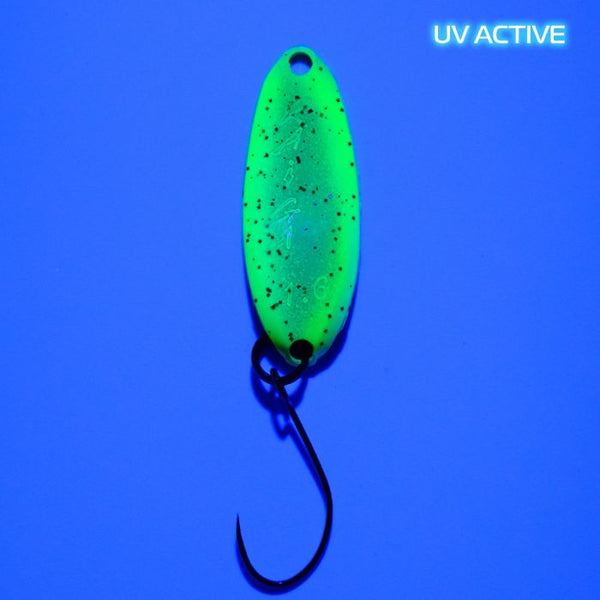 RAiGA von GOD HANDS ist ein gegossener Spoon, der dank seiner komplizierten, in japanischen Laboren entwickelten Form über jegliche Vorstellung hinausgeht. Sein abgeschrägtes Profil verringert den Widerstand bei der Köderführung und lässt RAiGA selbst bei kleinster Geschwindigkeit stabil und hochfrequent laufen. Das provoziert nahezu jeden – insbesondere passiven – Fisch zum Biss. Und das Ganze bei einem Gewicht von 1.6 g und perfekten Flugeigenschaften, so dass man am Wasser bestens für einen erfolgreichen Tag gewappnet ist.