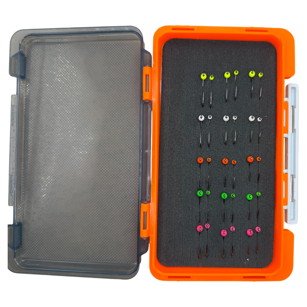 In der Box sind 4er 6er und 8er in 2 Tungsten Gewichten ( 3mm und 4mm Perlen ) in 5 verschiedenen.Farben perfekt zum Start.