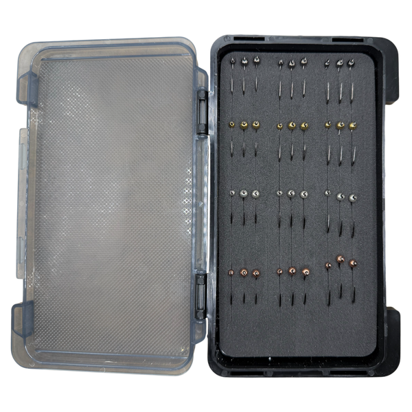 In der Box sind 4er 6er und 8er in 2 Tungsten Gewichten ( 3mm und 4mm Perlen ) in 4 verschiedenen.Farben perfekt zum Start.